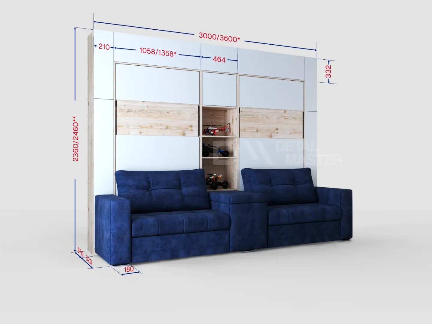 Дополнительные опции, такие как: освещение, зарядное устройство, розетки, мягкое изголовье, матрас, мягкий борт - не входят в стоимость шкаф-кровати "Twin 2.0". Вы всегда можете самостоятельно их добавить в опциях или написать менеджеру при оформлении заказа.
